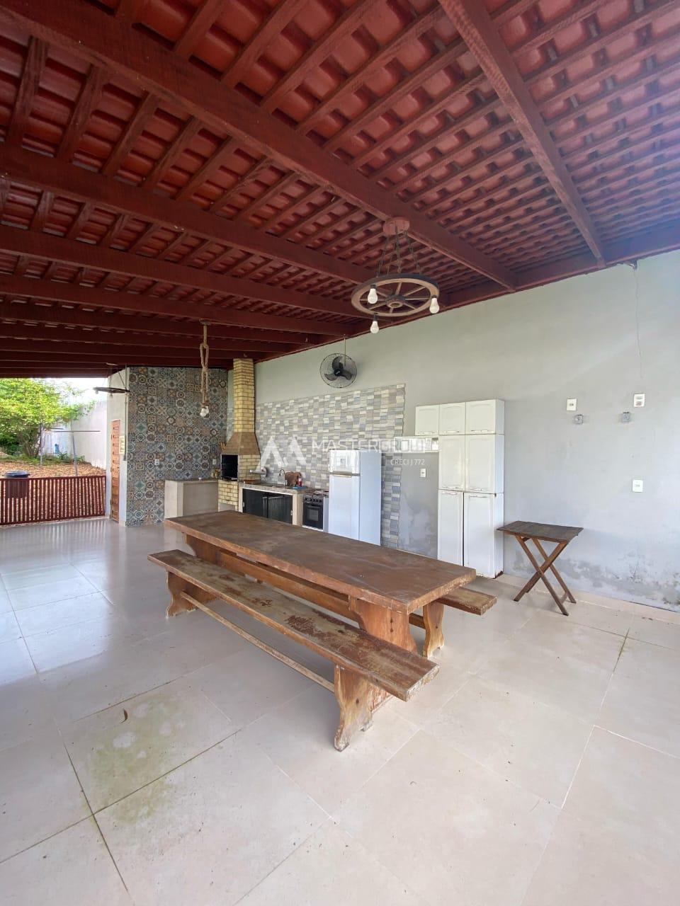 - Área Gourmet: equipada com uma mesa de madeira aconchegante, pia prática, fogão a gás com 4 bocas e forno, uma geladeira convencional, uma caixa térmica 360L para manter suas bebidas conservadas, e uma churrasqueira ideal para reunir amigos e família em torno de um bom churrasco.